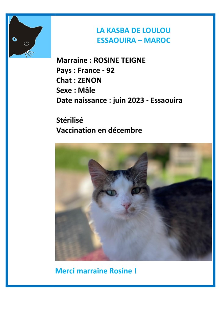 Merci à mon amie Wilma d’avoir financer la vaccination 2025 de Simba ! Mon amie Françoise avait laissé une somme pour ses chats… plus d’un an après je n’ai toujours pas reçu cet argent bloqué en banque… Merci le Maroc et la Suisse…