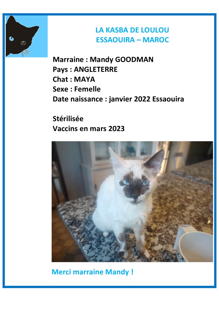 Merci (avec du retard…) à Mandy Goodman d’avoir choisi de parrainer Maya et ainsi financer sa stérilisation et sa vaccination !