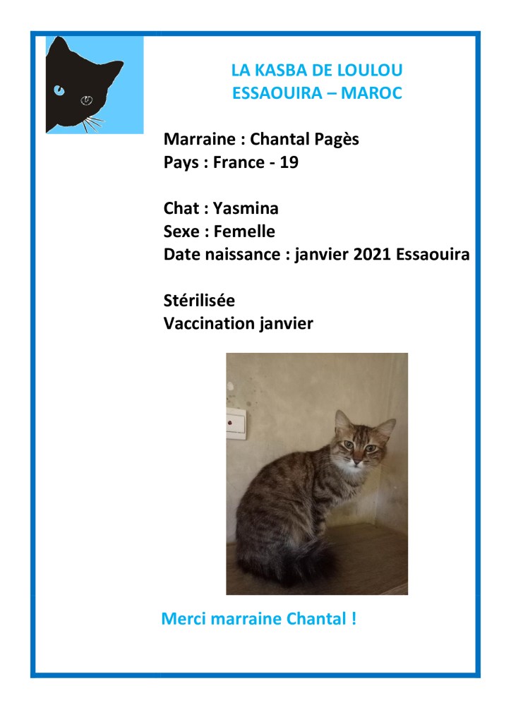 Merci à mon amie Chanchan Pagès d’avoir choisi de parrainer Yasmina et ainsi financer sa stérilisation et sa stérilisation ! Yasmina attendait un parrain ou une marraine depuis longtemps…