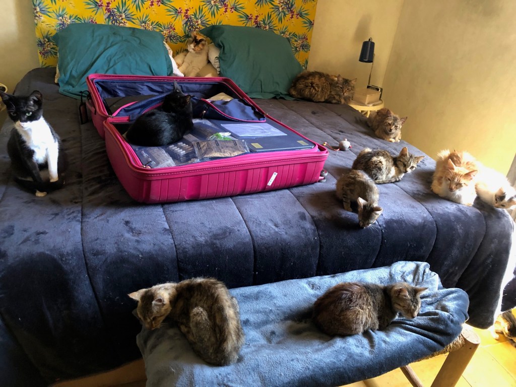 Les chats sont curieux de voir ce qui se trouve dans la valise : médicaments, Hydracare, jouets, croquettes spéciales…