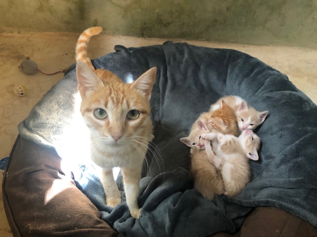 Titine (ancien nom Nica) et ses 4 bébés sont arrivés à la maison hier dans la salle de bain de papa Bernard.