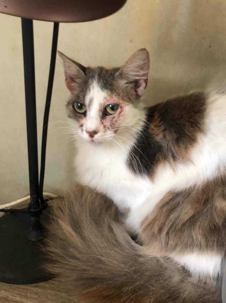 Samir, un parrain de quartier m’a signalé Sofia malade. Il s’occupe de Sofia et une autre chatte dans un appartement, car leur propriétaire est atteinte d’un cancer et elle est soignée depuis des semaines à l’extérieur.