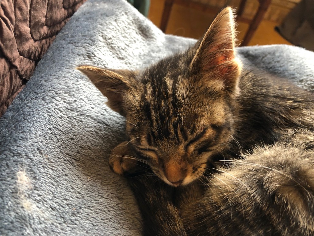Fifillette a dévoré une fois arrivée à la maison et ensuite gros dodo. Elle reste encore sur ses gardes, mais pas pour longtemps avec ses petits copains du bureau/nurserie.