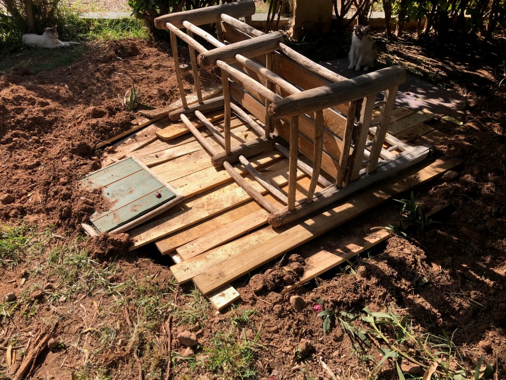 On casse le ciment et on doit vider à la main toute l’eau sale… pour déboucher et comprendre le système d’évacuation des eaux usées à la marocaine… (pas de fosse septique…)