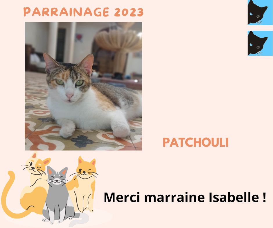 Merci (avec beaucoup de retard…) à marraine Isa Fislis pour le renouvellement du parrainage de sa filleul Patchouli pour la 2ème année, son rappel de vaccination est ainsi financé !