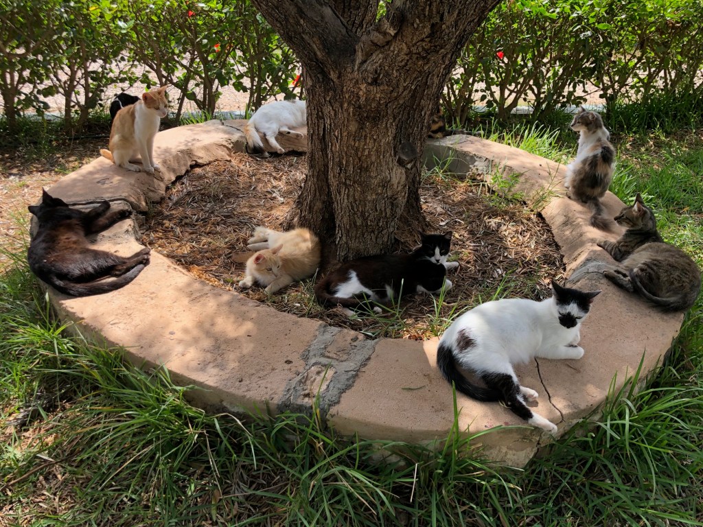 En photo : sieste des adultes au pied du grand olivier côté jardin des chiens