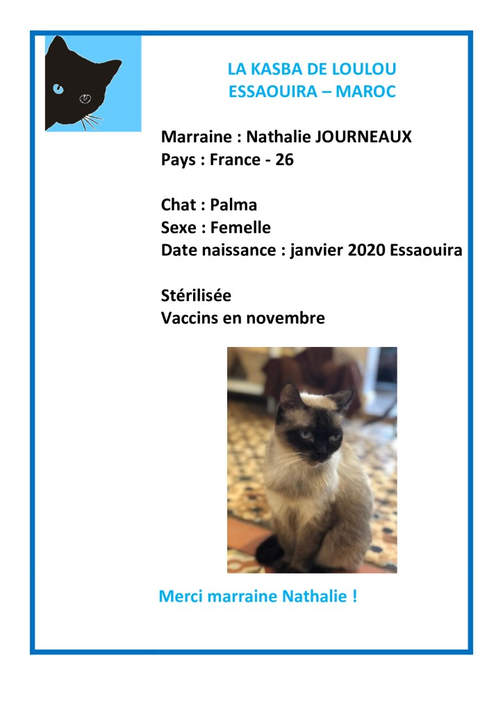Merci avec beaucoup de retard… à Nath Jrx d’avoir choisi de parrainer Palma et d’avoir ainsi financé sa vaccination annuelle et sa stérilisation !