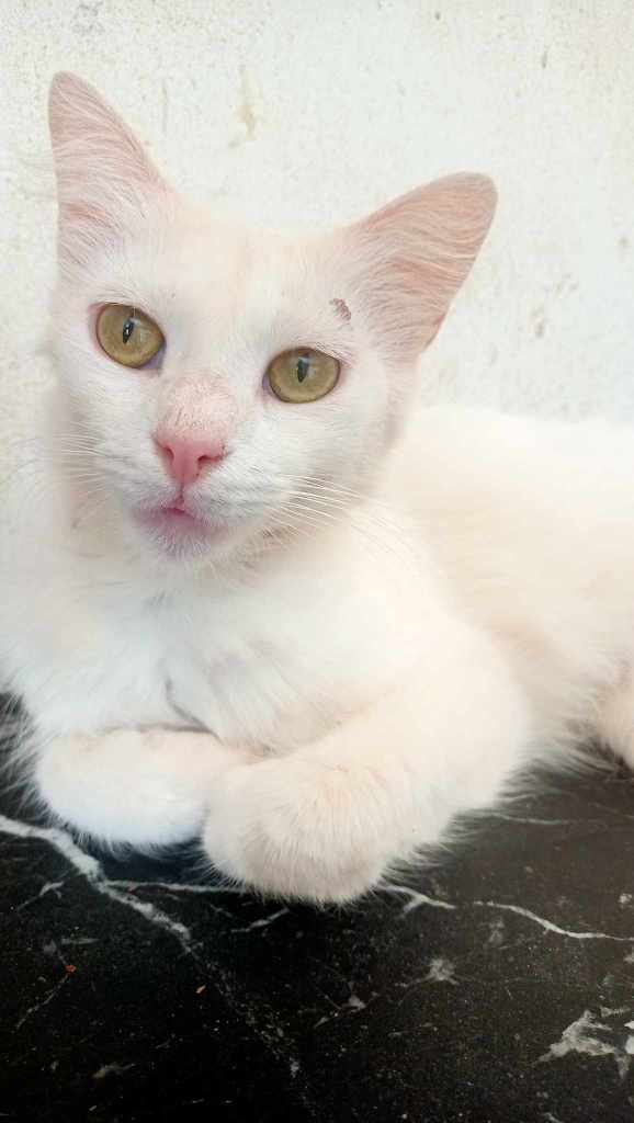 Victoire est très attachante, avec son problème de vision, elle cherche toujours le regard… Elle adore les croquettes bonbons.