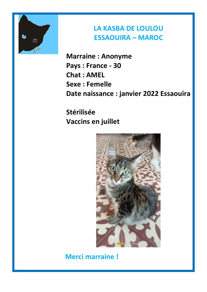 Merci à une anonyme d’avoir choisi de parrainer Amel et d’avoir ainsi financé sa vaccination annuelle et sa stérilisation !
