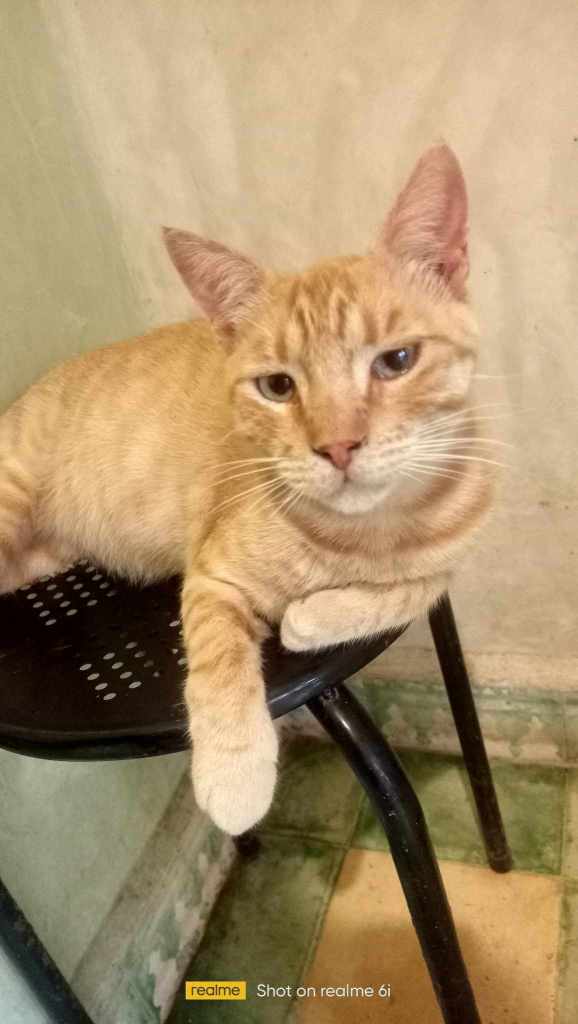 Orion toujours là au moment des repas de pâtée et Lutti, qui garde les bols de croquettes, jusqu’à s’endormir dessus !