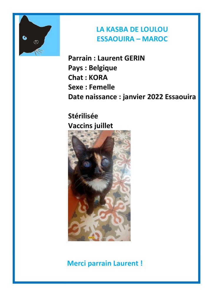 Merci à Laurent Gérin d’avoir choisi de parrainer Kora et ainsi avoir financé sa vaccination annuelle !