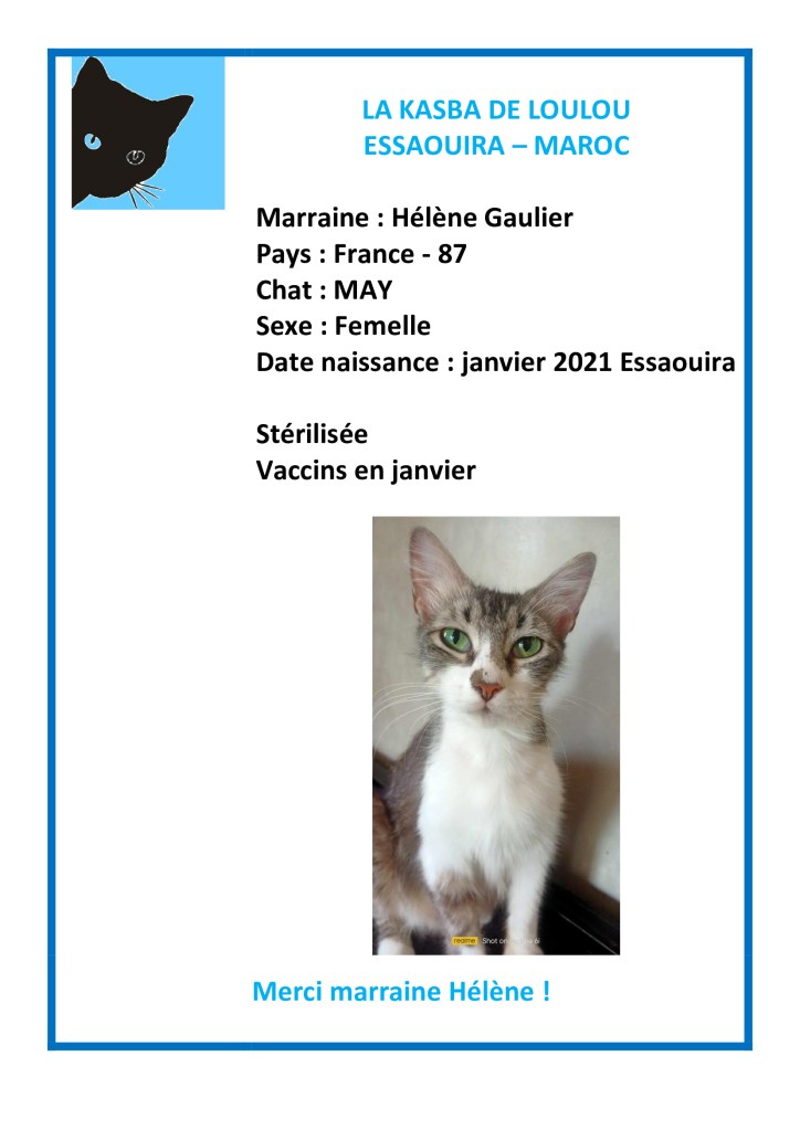 Merci à Helene Gaulier d’avoir choisi de parrainer May et ainsi avoir financé sa vaccination annuelle, sa stérilisation et un MiamMiam !