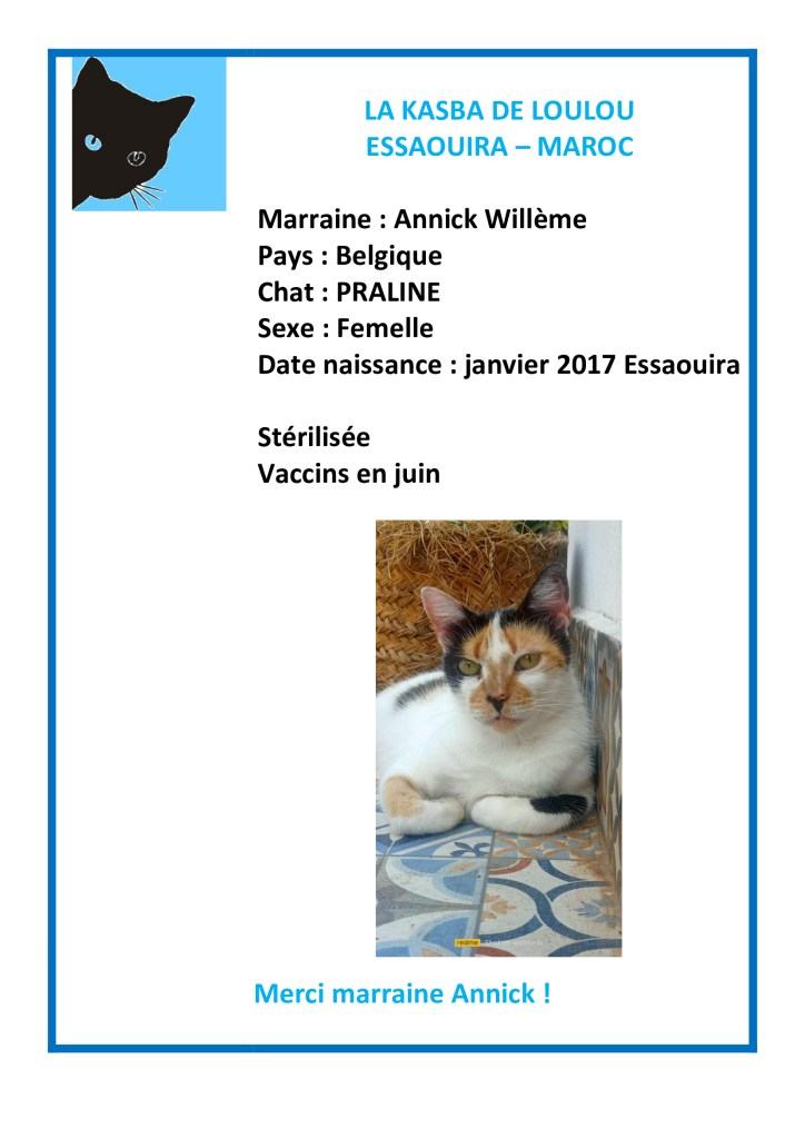 Merci à Annick Willème d’avoir choisi de parrainer Praline et ainsi avoir financé sa vaccination annuelle.