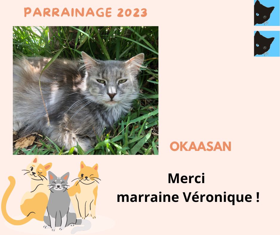 Merci avec beaucoup de retard… à Véronique Voirin Weber pour le renouvellement du parrainage de sa filleule Okaasan pour la 2ème année ! Et ainsi financer sa vaccination annuelle et un don MiamMiam !