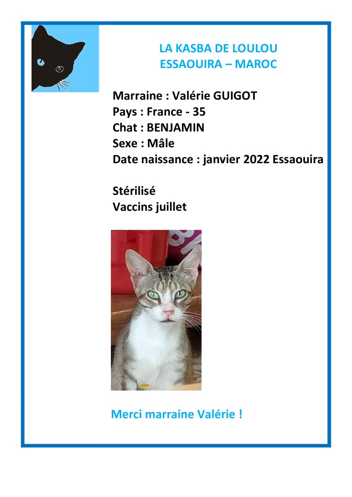 Merci à Valerie Guigot d’avoir choisi de parrainer Benjamin et ainsi avoir financée sa vaccination annuelle et sa stérilisation !