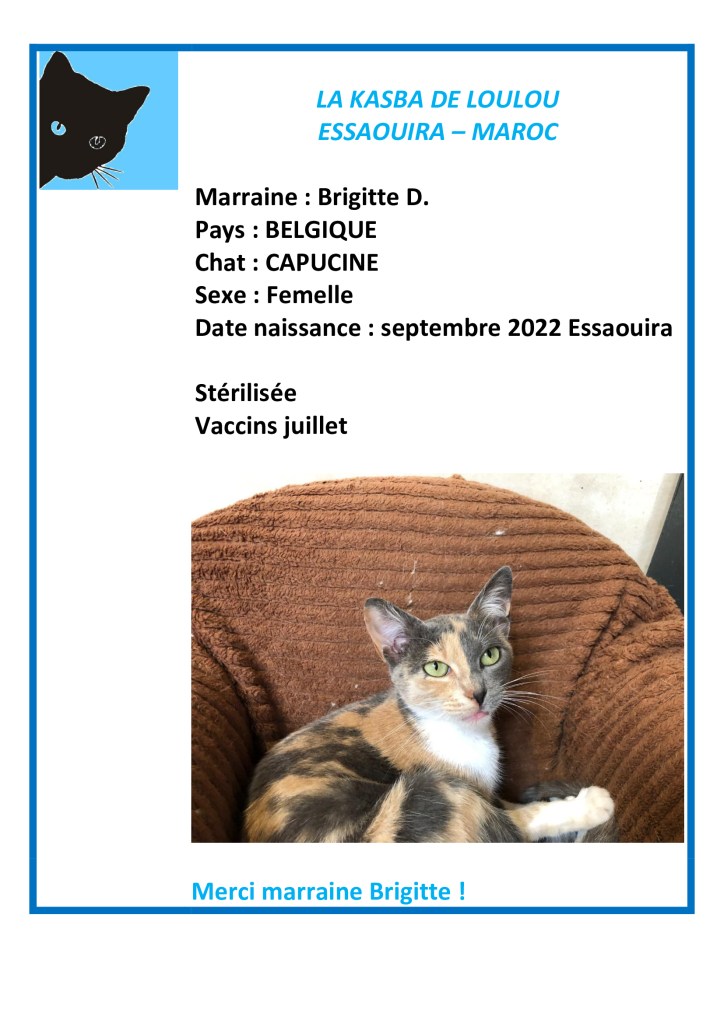 Merci à Brigitte D. d’avoir choisi de parrainer Capucine et ainsi avoir financée sa vaccination annuelle et sa stérilisation !