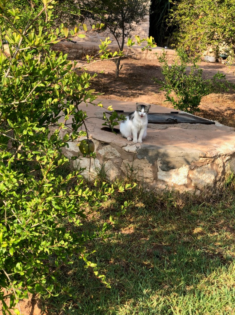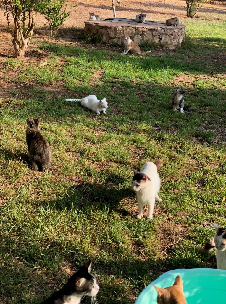 En photo : le jardin des chiens avec les chats en fin de soirée qui prennent le frais. On aperçoit le puits. Oui, pas d’eau courant ici… un puits avec de l’eau non potable… et les problèmes techniques qui vont avec…