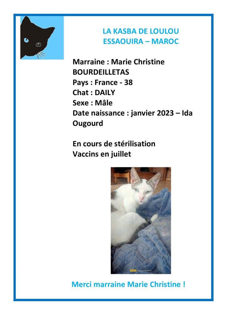 Merci à Marie Christinr Boutfeilletas d’avoir choisi de parrainer Daily et ainsi avoir financée sa vaccination annuelle !