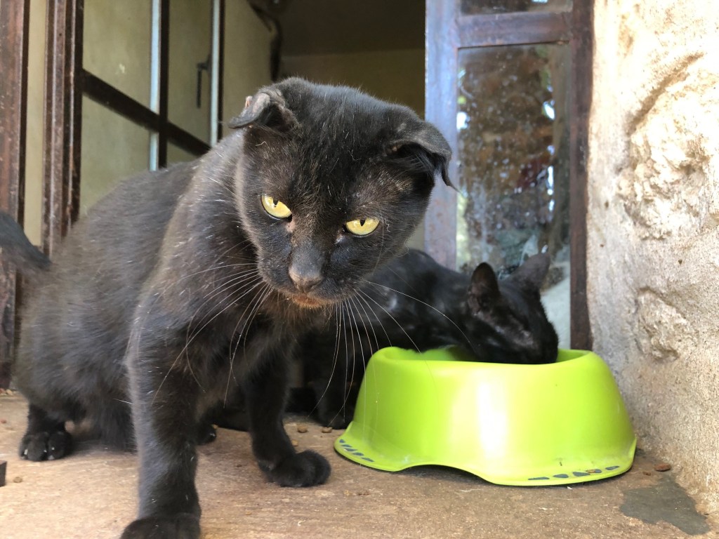 Dada vit sa petite vie tranquille dans le jardin des chats et mange les croquettes sur la fenêtre de la buanderie.