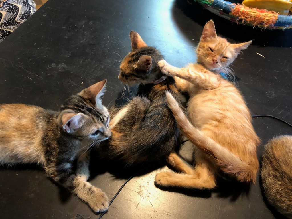 En photo : 3 des petits orphelins sur 70 environs en ce moment… sur la table où se trouve mon ordinateur… un coup sur les touches… un coup sur le tapis de souris… la concentration est difficile… il ne faut surtout pas s’absenter l’ordinateur ouvert…. car des surprises en revenant…