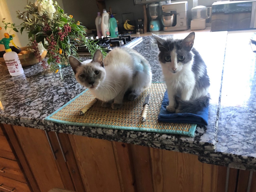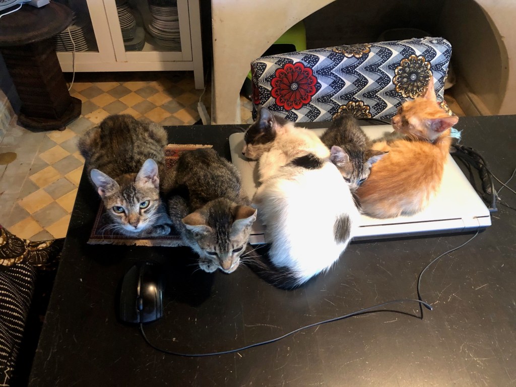 En photo : mon bureau occupée par les chatons, et sur la table de la cuisine où j’ai mis mon ordinateur… difficile aussi..