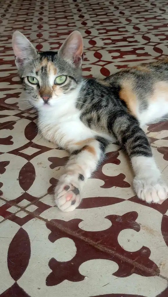 Marias est une petite chatte douce qui vit tranquillement avec tous ses copains principalement dans la maison et le jardin des chats.