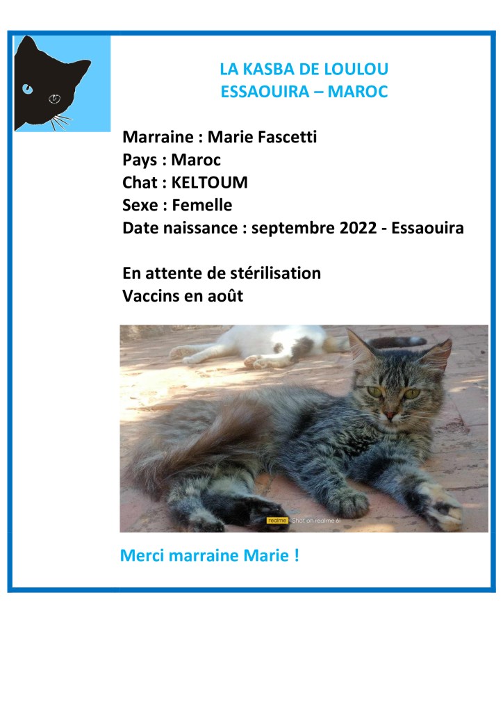 Merci (avec du retard…) à Marie Fascetti d’avoir choisi de parrainer Keltoum et ainsi financé sa vaccination annuelle !