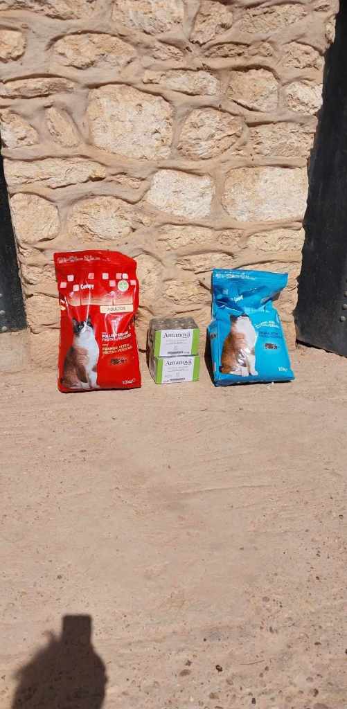 Merci à Nicole Racine d’avoir donné aux chats de La kasba de Loulou des croquettes et des pâtés remis pour elle par des donateurs espagnols !