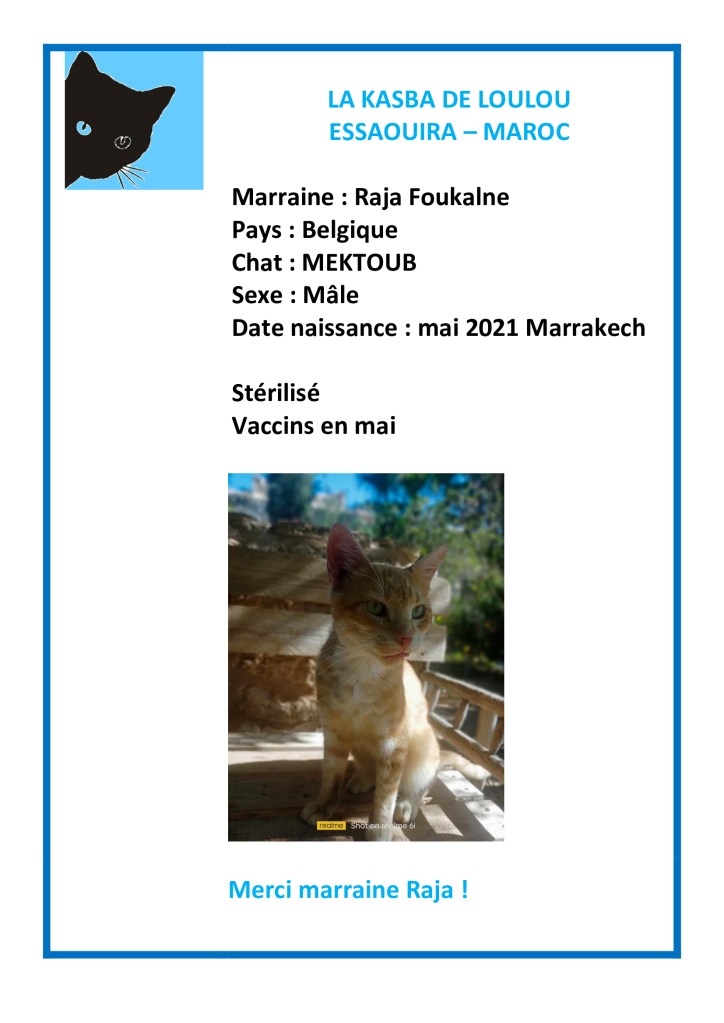 Merci à Raja Fkl pour avoir choisi de parrainer Mektoub et ainsi financé sa vaccination annuelle !