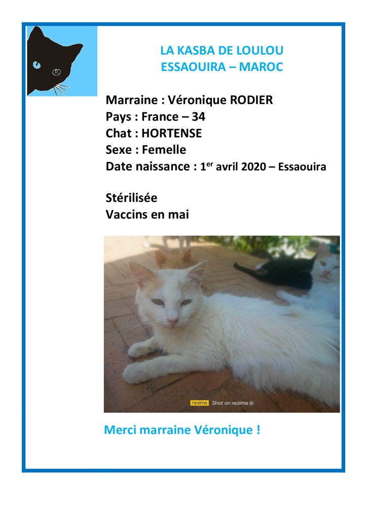 Merci à Veronique Rodier pour avoir choisi de parrainer Hortense et ainsi financé sa vaccination annuelle !