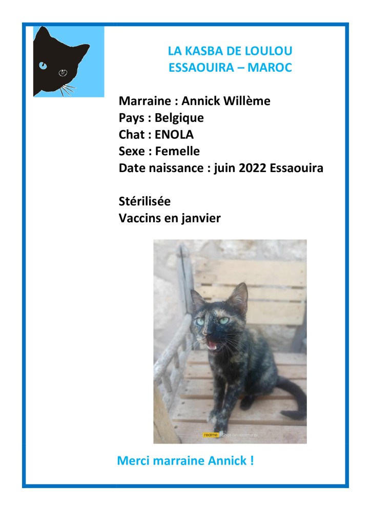 Merci (avec beaucoup… beaucoup de retard…) à Annick Willème pour avoir choisi de parrainer Enola et ainsi financé sa vaccination annuelle !