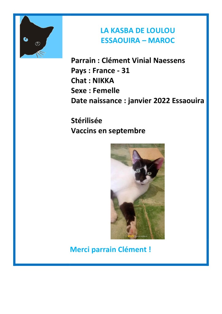 Merci (avec beaucoup… beaucoup de retard…) à Clément Vinial-Naessens pour avoir choisi de parrainer Nikka et ainsi financé sa vaccination annuelle !