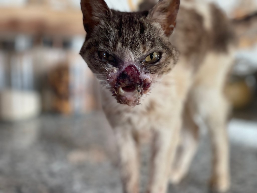 Lors d’un nourrissage dans le village, j’ai trouvé Mund…. J’étais accompagnée de Yolaine Bellard. Je savais que ses jours étaient comptés (cancer du nez)… 2 semaines à la maison…. mais elle a pu manger, vivre en sécurité, avoir des caresses et de l’attention…