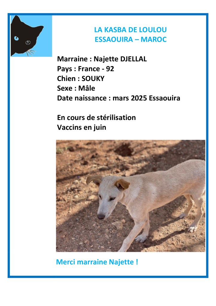 Merci (avec du retard…) à Naj Dje d’avoir choisi de parrainer Souky pour financer sa vaccination annuelle et sa 2ème vaccination pour la 1ère année !