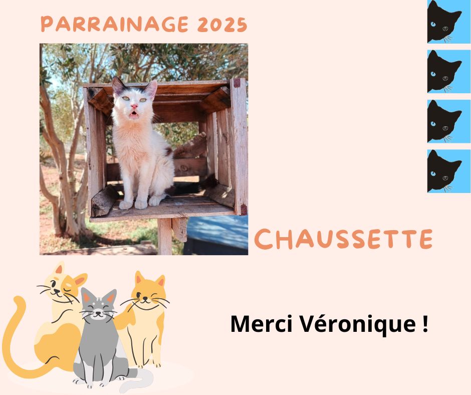 Merci (avec beaucoup de retard…) à marraine Véronique Duez pour le renouvellement du parrainage de sa filleule Chaussette pour la 4ème année et ainsi financer sa vaccination annuelle 2025 !