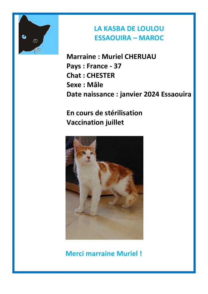 Merci à Muriel Cheruaud’avoir choisi de parrainer Chester pour financer sa vaccination annuelle !
