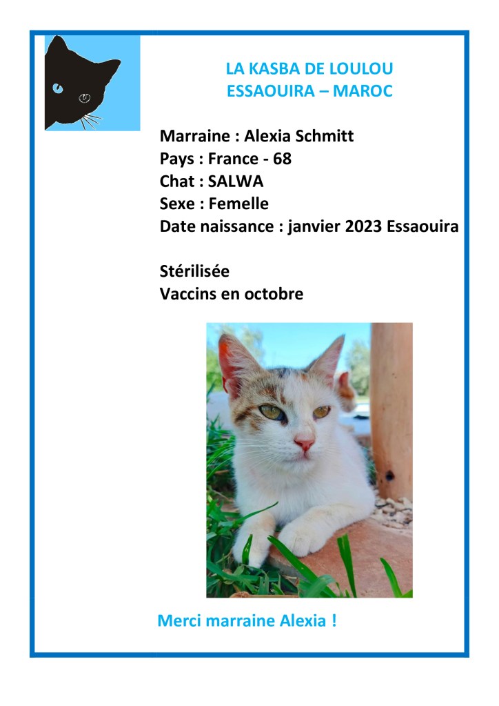 Merci à Alexia Schmitt d’avoir choisi de parrainer Salwa pour financer sa vaccination annuelle !