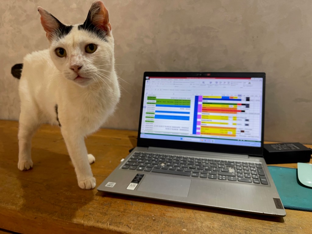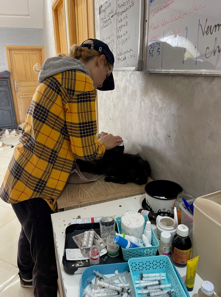 En photo : Pauline m’assiste avec Mamita (qui attend ses fromages toutes la durée des soins). Nahid et moi, toutes seules le jeudi pour traiter plus de 100 chats..