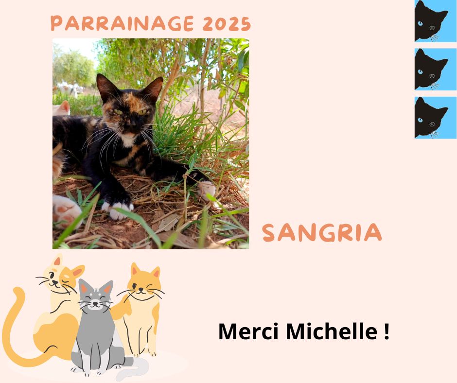 Merci à marraine Michelle Attar pour le renouvellement du parrainage de sa filleule Sangria pour la 3ème année et ainsi financer sa vaccination annuelle 2025 et un petit MiamMiam !