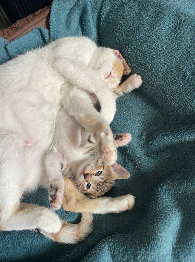 Des parrains et marraines de quartier ont signalé une chatte en danger. Elle a accouché depuis plusieurs semaines et elle n’est pas très bien… Ils pensent que des bébés morts sont restés dans son ventre, seul un bébé est né.