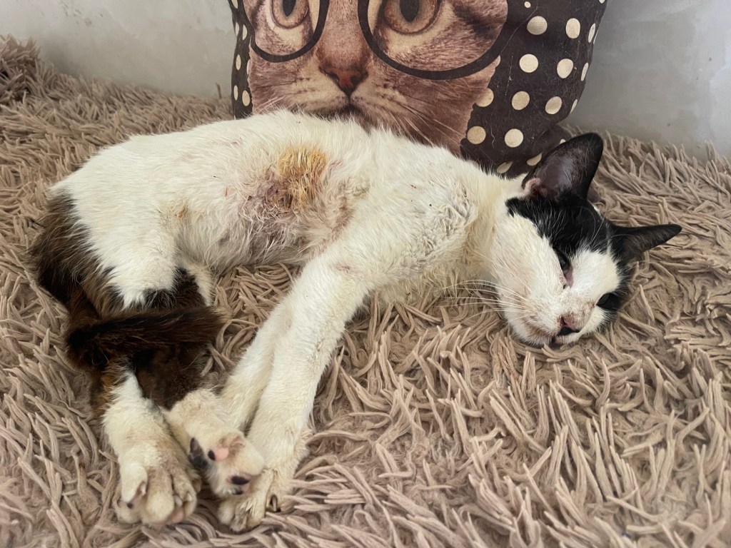 Halima, marraine de quartier a prévenu Raja El Abdi qu’une chatte était en souffrance dans la rue depuis 2 jours sûrement mordu par un chien…