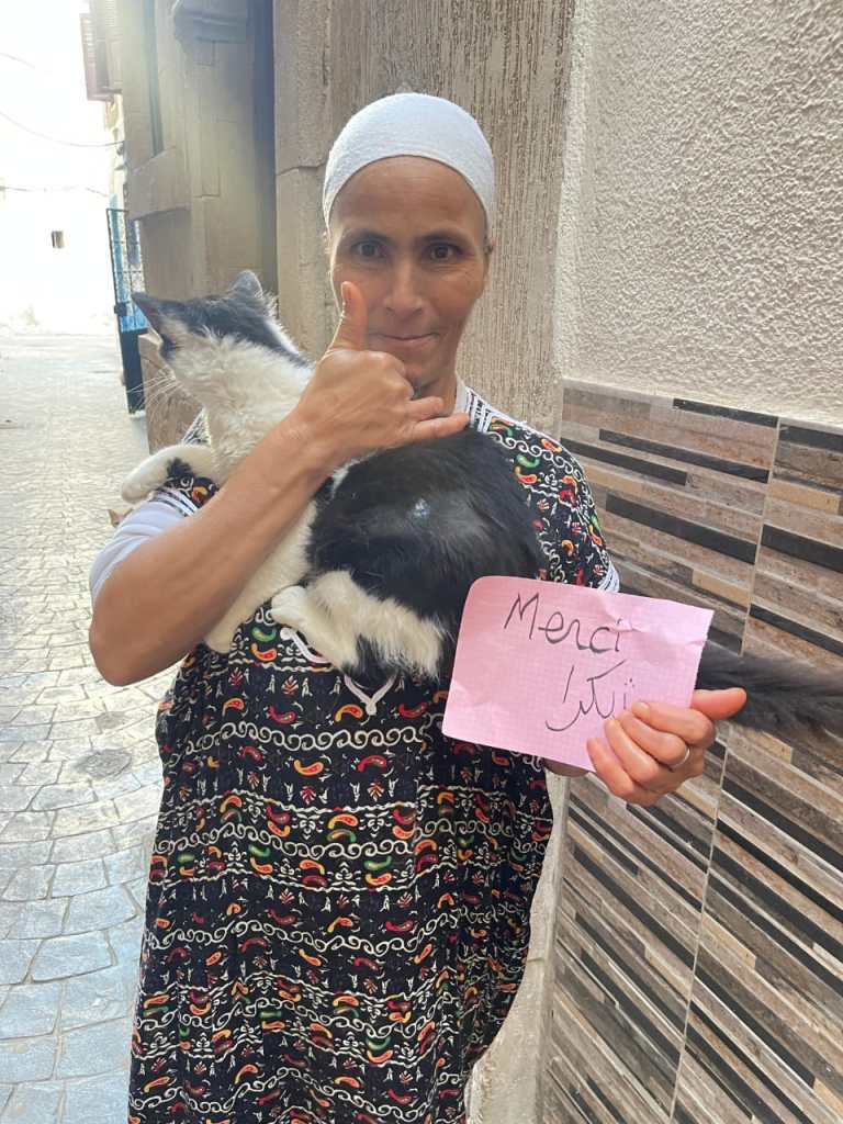 Aujourd’hui, Amina, marraine de quartier dans la médina, des rues pas du tout touristiques, a permis la stérilisation d’une soixantaine de chats en les capturant, les amenant chez nos 2 vétérinaires et en les relâchant.