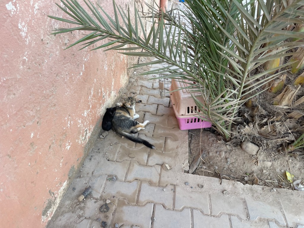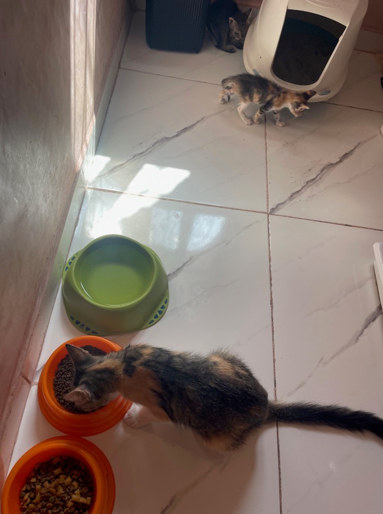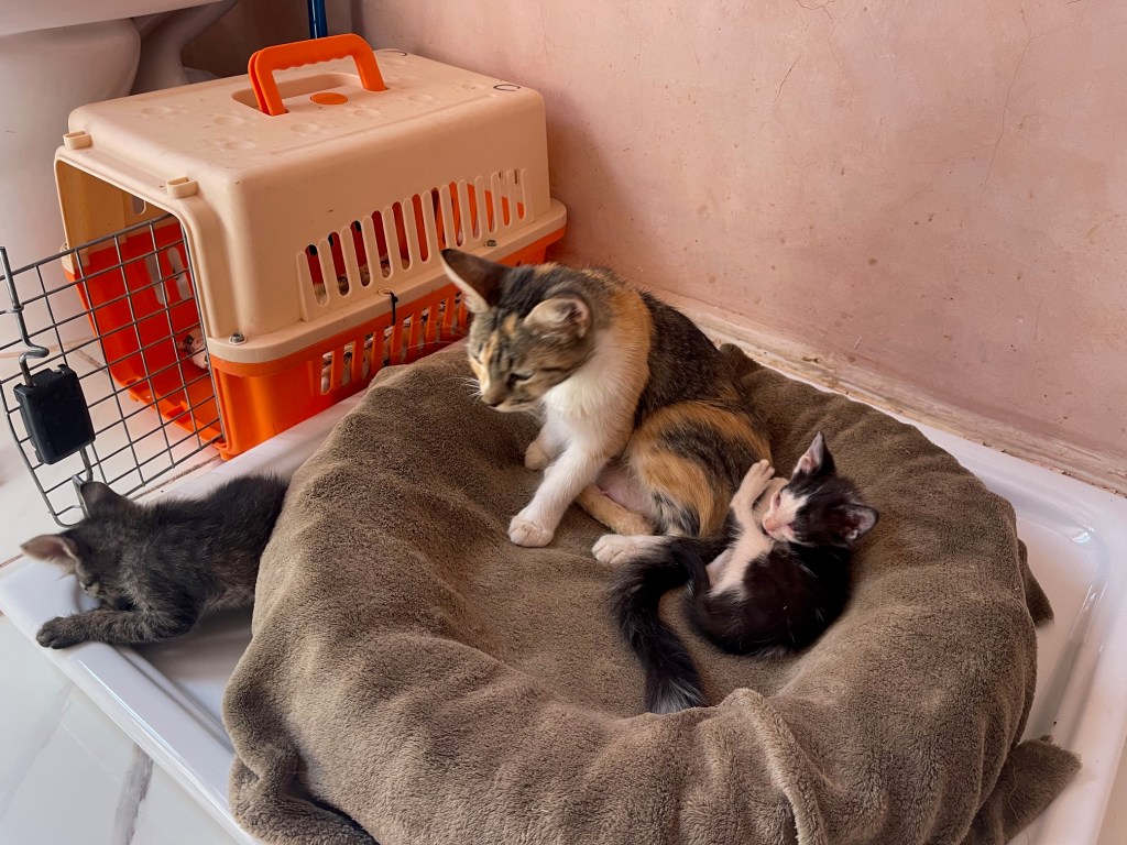 Zalinda et ses petits ont trouvé une petite place dans la salle de bain qui nous sert à nourrir les chats qui ne mangent pas tout seuls ou qui ont besoin de reprendre du poids.