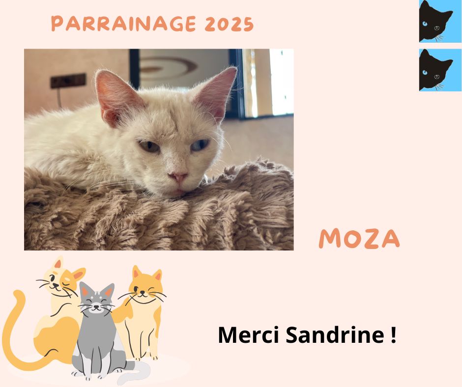 Merci à marraine Sandrine Monsché pour le renouvellement du parrainage de sa filleule Moza pour la 2ème année et ainsi financer sa vaccination annuelle 2025 et des MiamMiam !