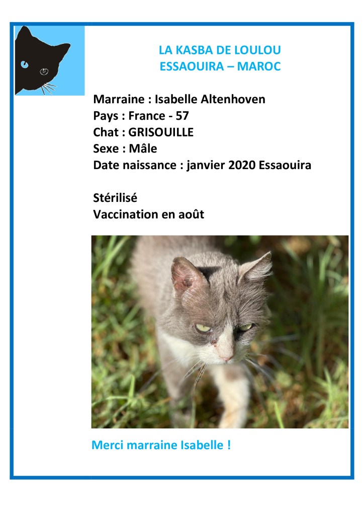 Merci à Isabelle Altenhoven d’avoir choisi de parrainer Grisouille et ainsi financer sa vaccination annuelle !