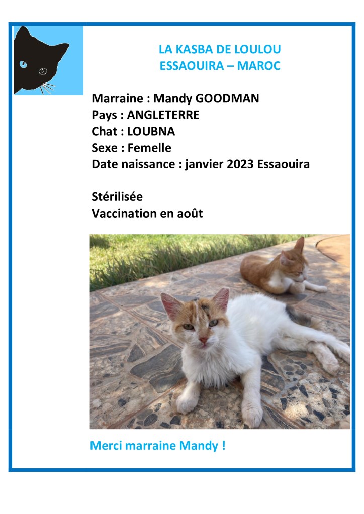Merci à Mandy Goodman d’avoir choisi de parrainer Loubna et ainsi financer sa vaccination annuelle !