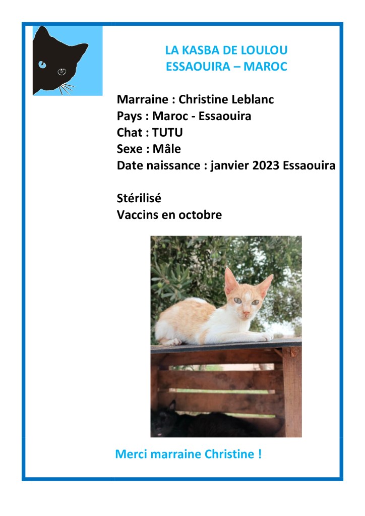 Merci à Christine Leblanc d’avoir choisi de parrainer Tutu et ainsi financer sa vaccination annuelle