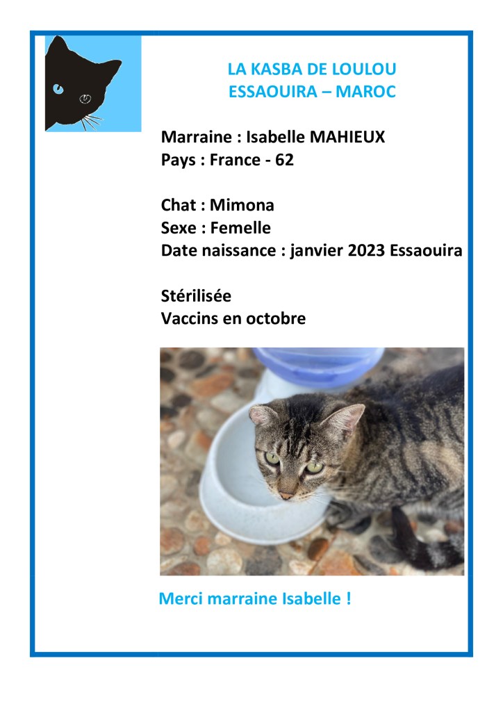 Merci à Isabelle Ledoux – Mahieux d’avoir choisi de parrainer Mimouna et ainsi financer sa vaccination annuelle !
