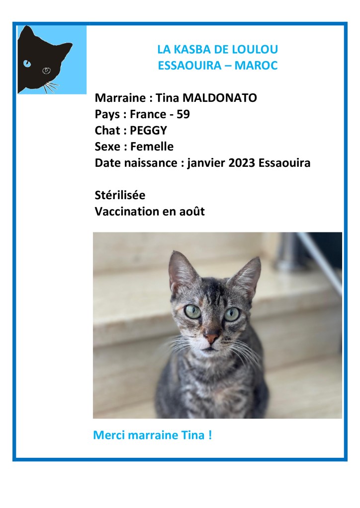 Merci à Tina Maldonato d’avoir choisi de parrainer Peggy et ainsi financer sa vaccination annuelle !