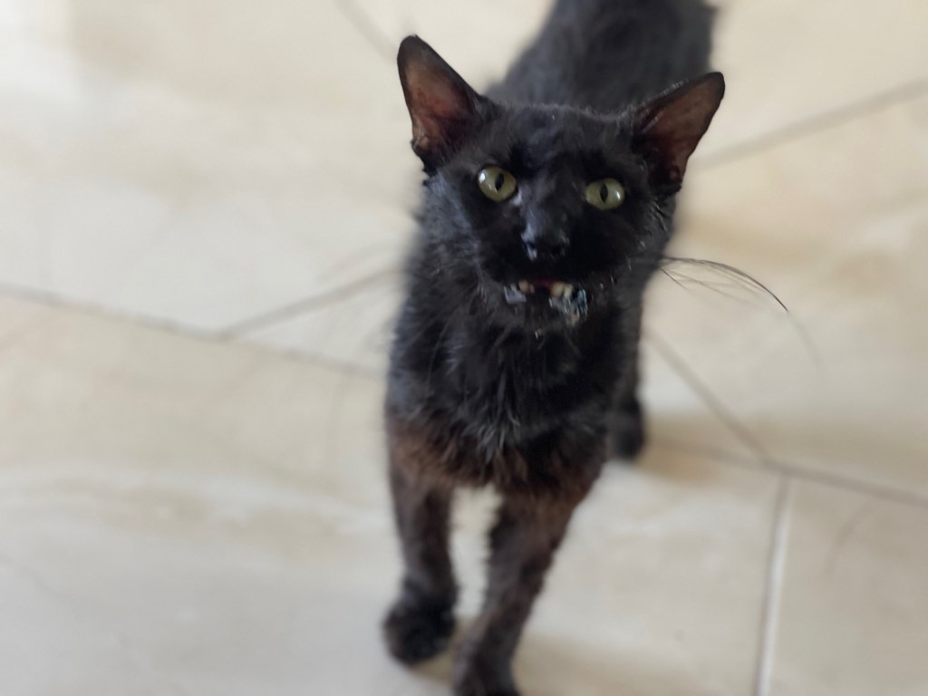 Lundi, je passe dans une rue un chat noir par terre… pas en forme… mon amie Danielle me dit de tourner la tête…